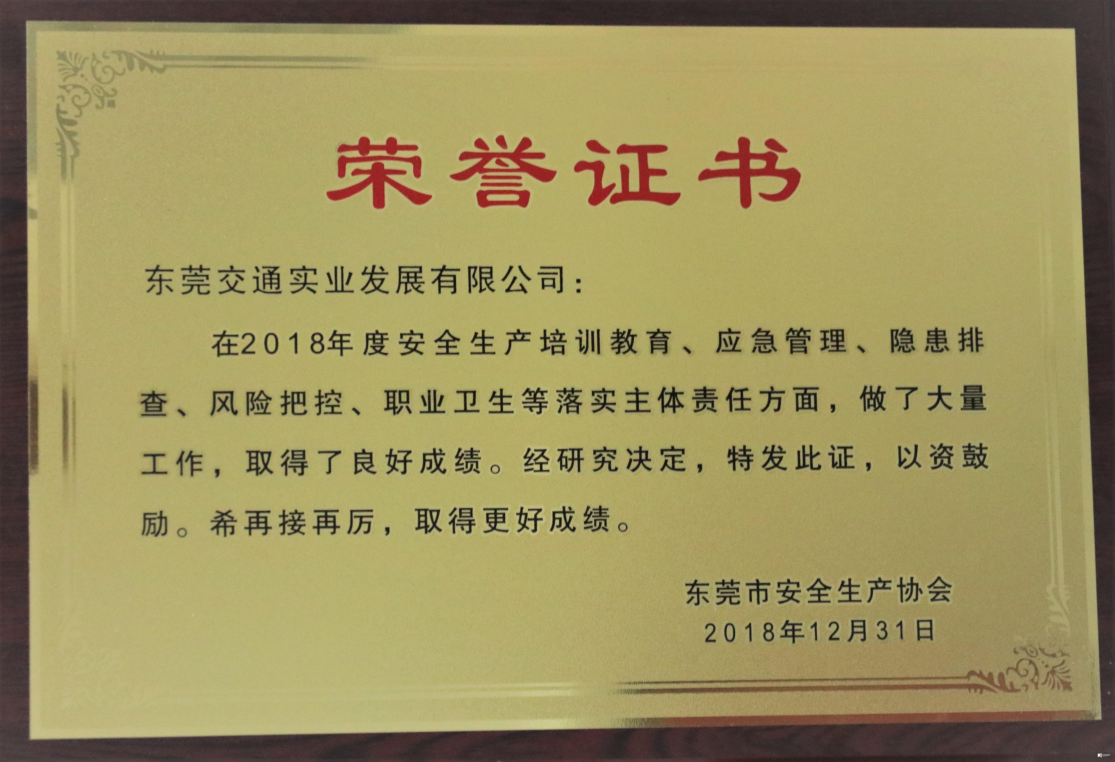 2018年12月,交通實(shí)業(yè)公司獲東莞市安全生產(chǎn)協(xié)會(huì)頒發(fā)2018年企業(yè)安全生產(chǎn)工作突出成績獎(jiǎng)。