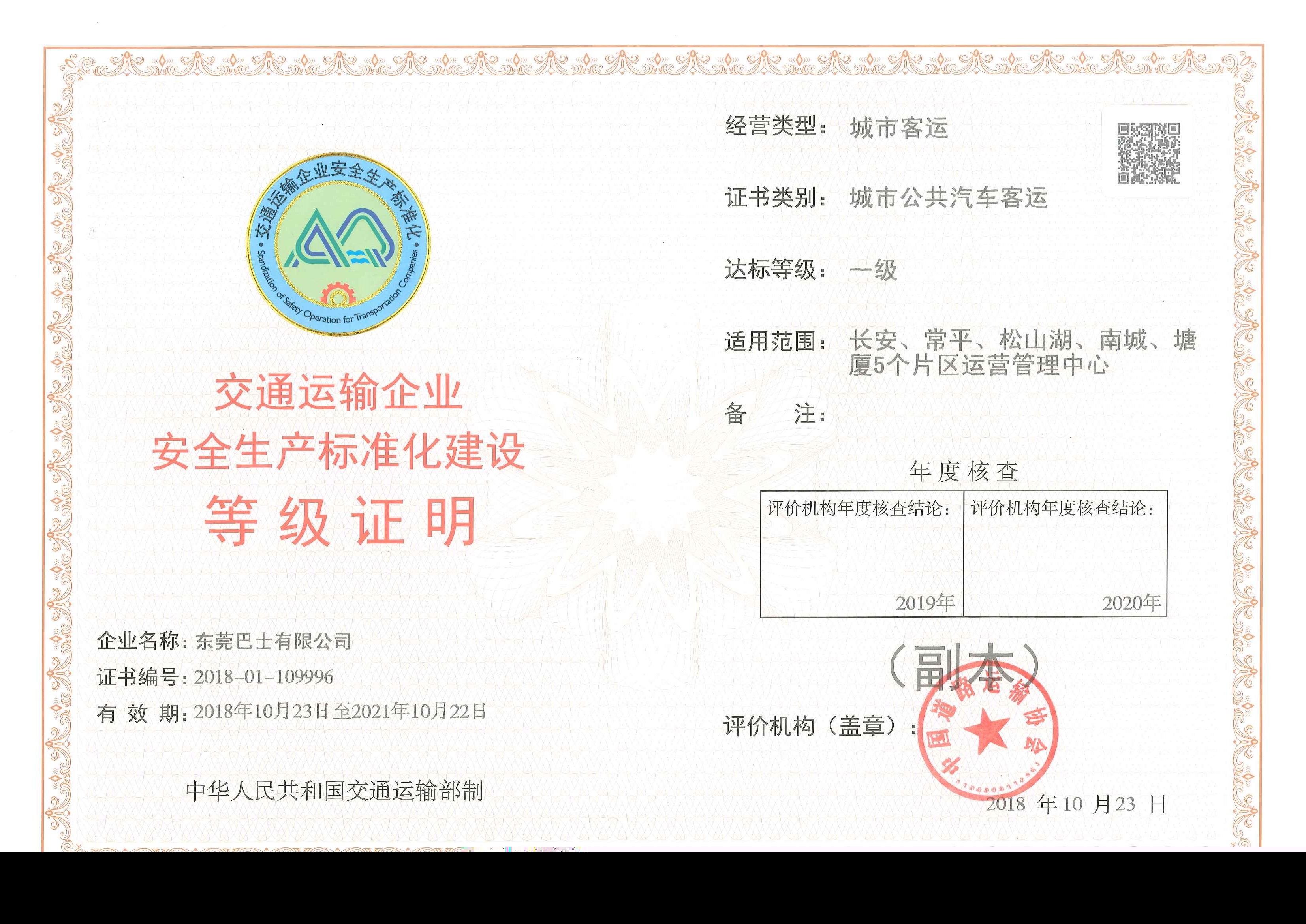 2018年10月,東莞巴士公司被中國道路運(yùn)輸協(xié)會(huì)評為城市公共汽車客運(yùn)安全標(biāo)準(zhǔn)化一級達(dá)標(biāo)企業(yè)。