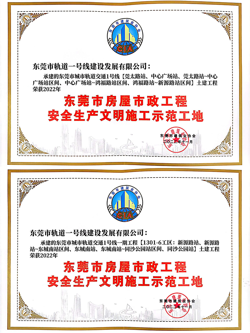 2022年11月,東莞市建筑業(yè)協(xié)會(huì)授予軌道一號線公司“東莞市房屋市政工程安全生產(chǎn)文明施工示范工地”榮譽(yù)稱號