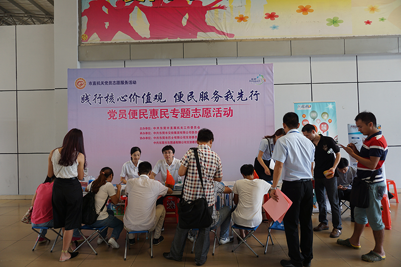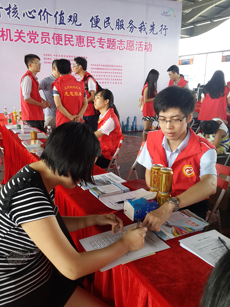 2015年8月29日,東莞通黨員、團(tuán)員在萬(wàn)江汽車總站,參加市直工委舉辦的“踐行核心價(jià)值觀,便民服務(wù)我先行”黨員志愿服務(wù)活動(dòng)。