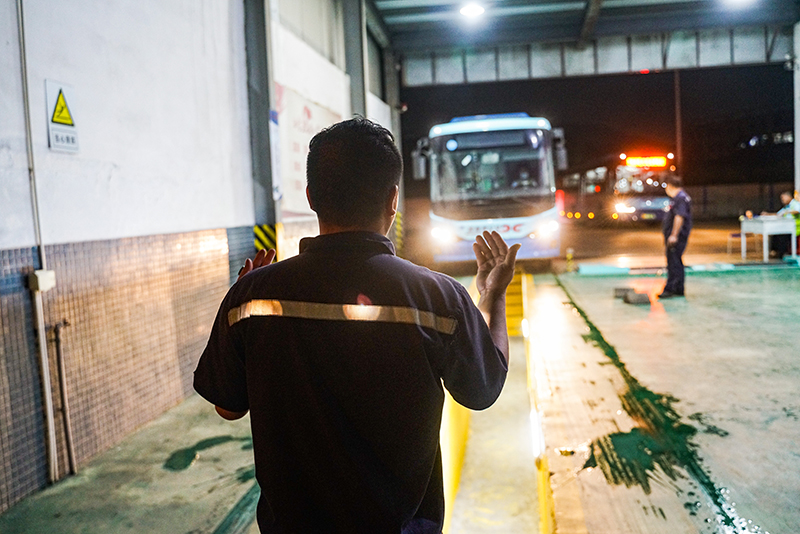 濱海灣公交公司長安涌頭停場維修車間維修師傅引導車輛進入檢修區(qū)域
