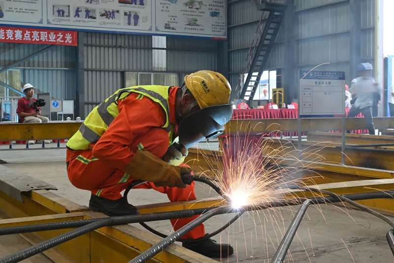 緊接著,來自中鐵十二局、中鐵十一局、中鐵大橋局、保利長大等施工單位的焊接高手們輪番上陣。他們?nèi)蔽溲b,手持焊槍,神情專注。一時(shí)間,作業(yè)區(qū)內(nèi)弧光閃爍、焊花璀璨,選手們沉穩(wěn)操作,盡顯精湛技藝與嚴(yán)謹(jǐn)態(tài)度。