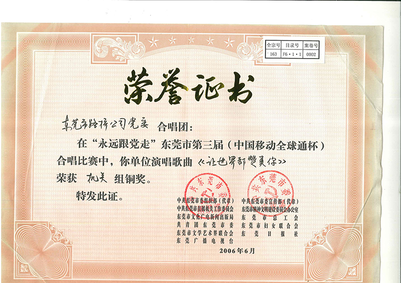 2006年6月30日,市路橋總黨委在“永遠(yuǎn)跟黨走”東莞市第三屆(中國移動全球通杯)合唱比賽中,以《讓世界都贊美你》榮獲機關(guān)組銅獎。