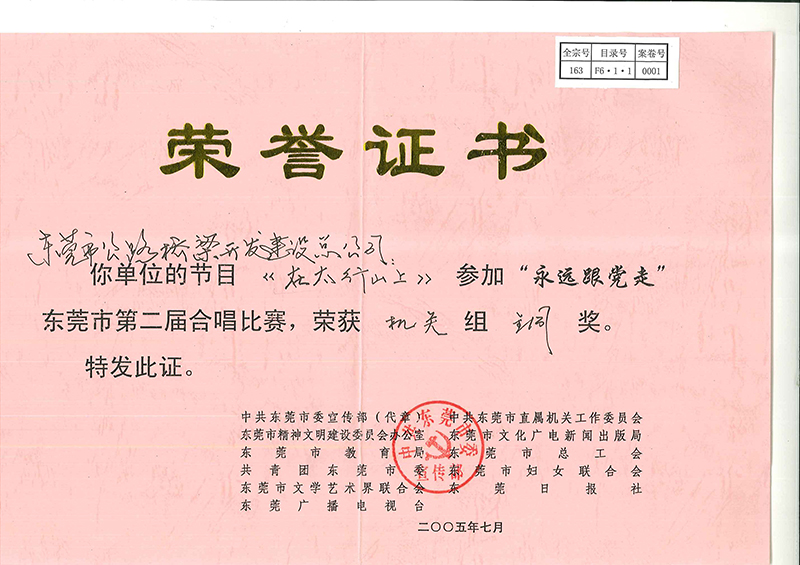 2005年7月30日,市路橋總榮獲“永遠(yuǎn)跟黨走”東莞市第二屆合唱比賽“銅獎”。