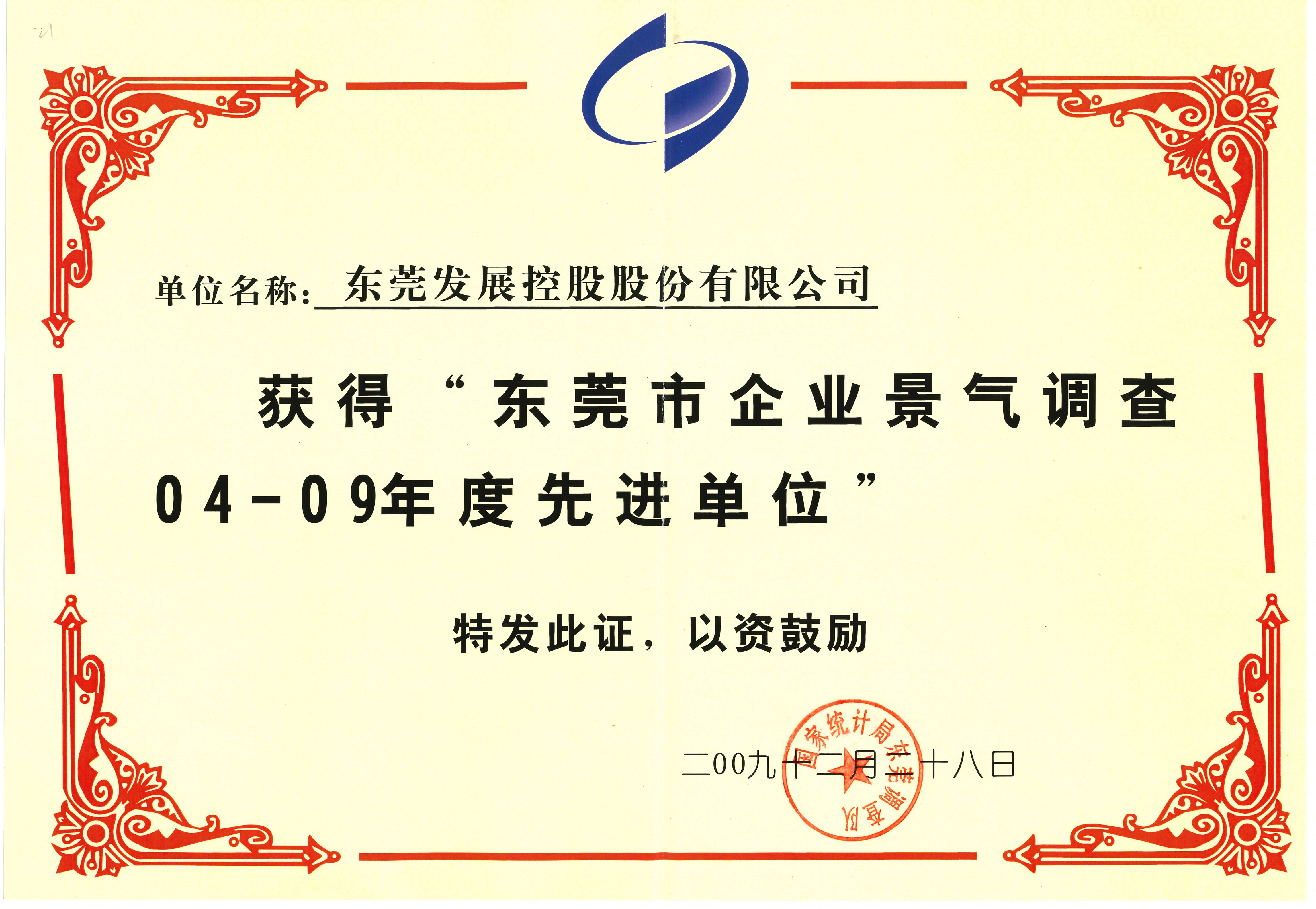2009年12月,東莞控股公司榮獲“東莞市企業(yè)景氣調(diào)查2004-2009年度先進單位”榮譽稱號。