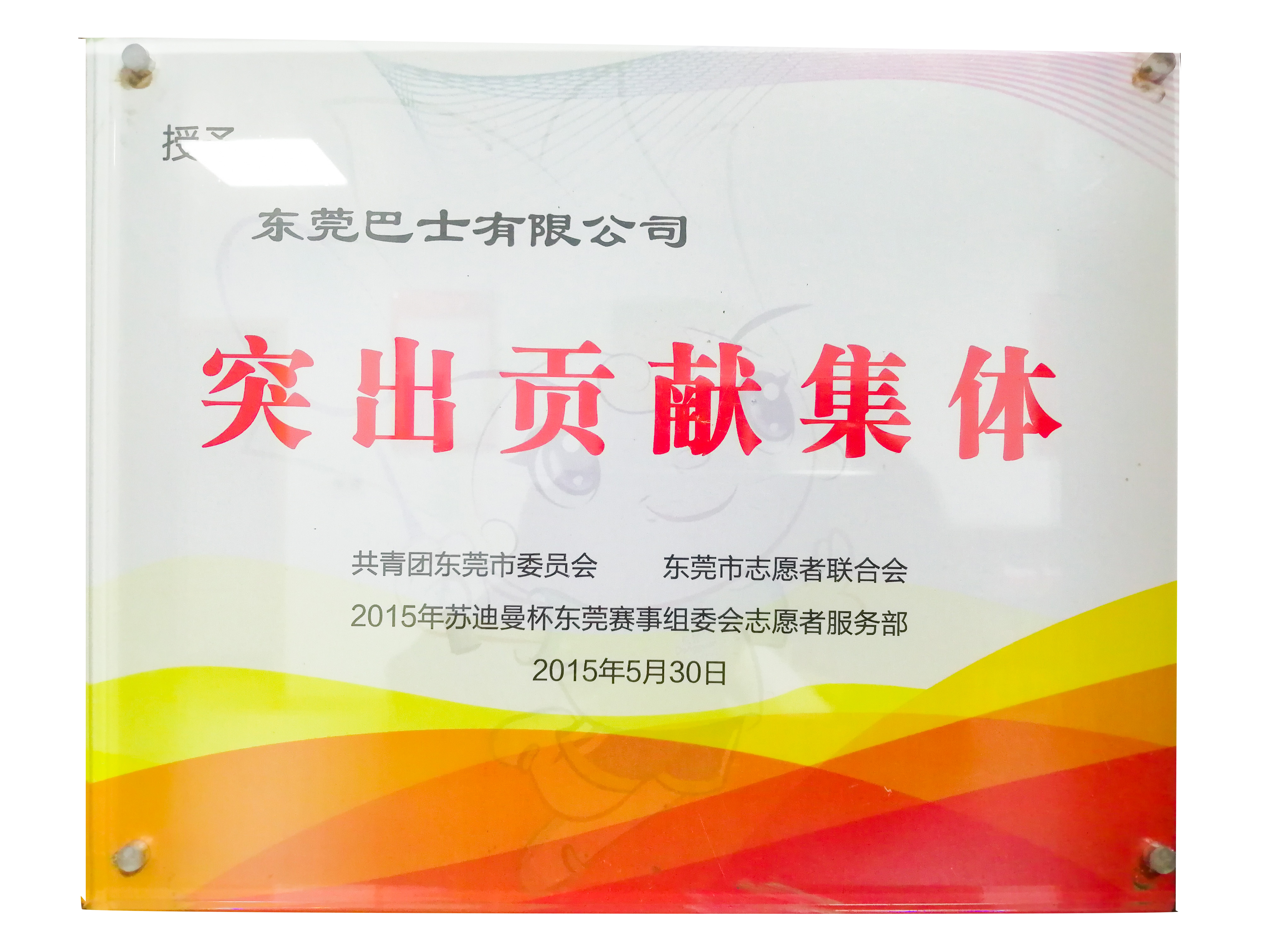 2015年5月,東莞巴士公司榮獲共青團東莞市委員會、東莞市志愿者聯(lián)合會、2015年蘇迪曼杯東莞賽事組委會志愿者服務部授予的“突出貢獻集體”榮譽稱號。