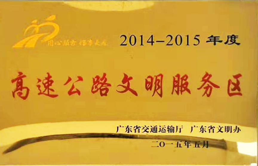 2015年5月,廣東省交通運輸廳、廣東省文明辦授予東莞控股公司2014-2015年度“高速公路文明服務區(qū)”榮譽稱號。