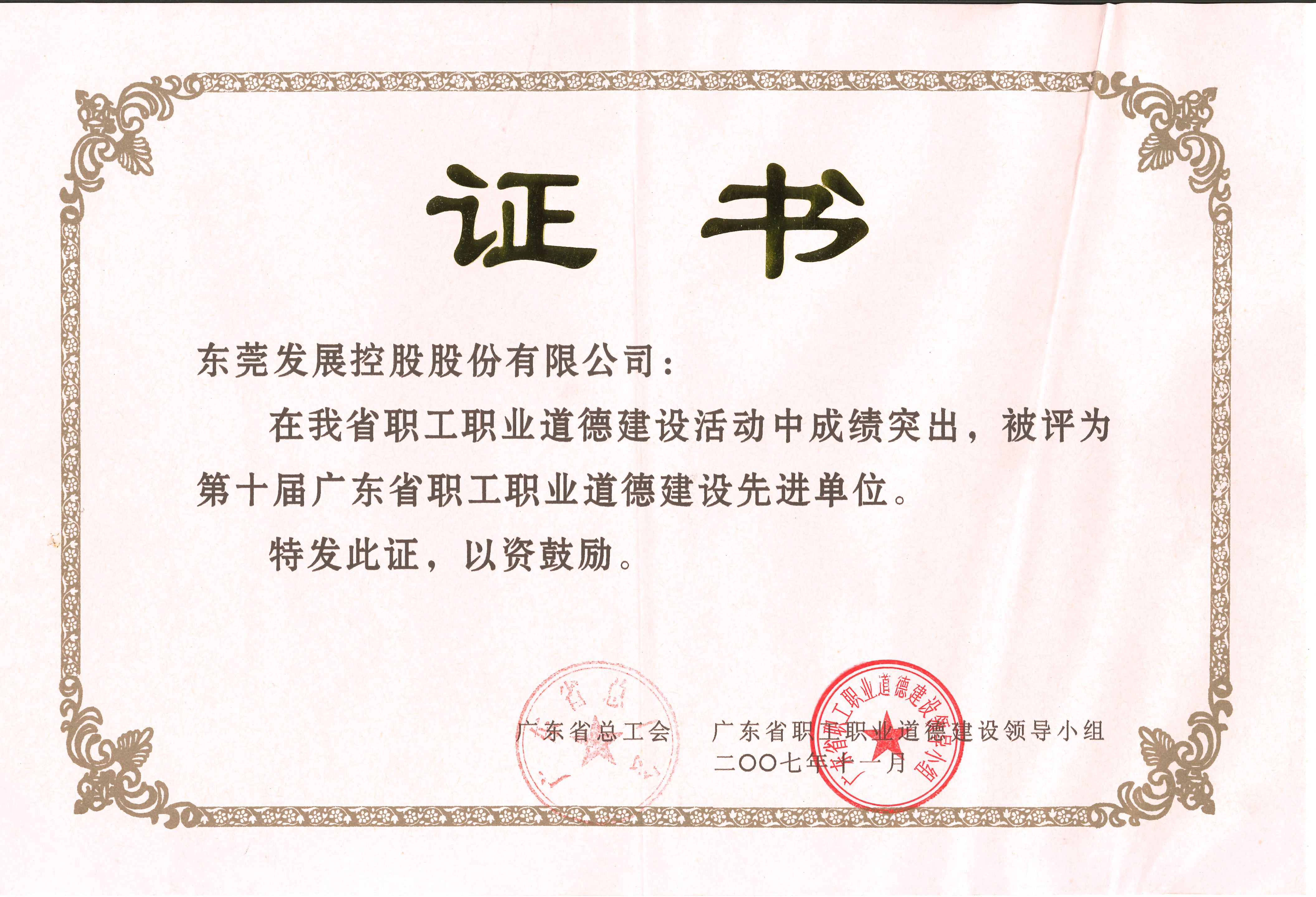 2007年11月,東莞控股公司被廣東省總工會、廣東省職工職業(yè)道德建設領導小組評為第十屆廣東省職工職業(yè)道德建設先進單位。