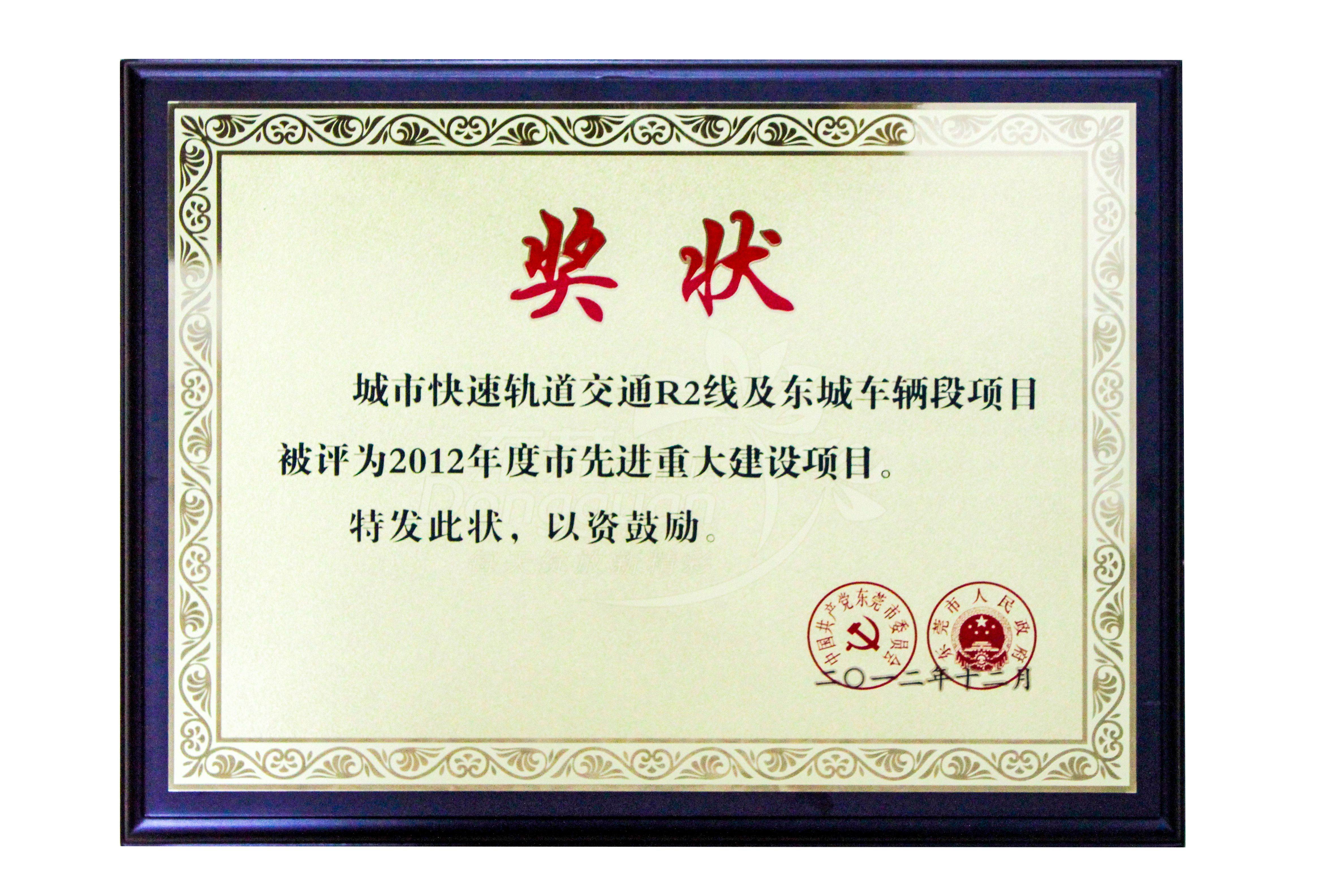 2012年12月,城市快速軌道交通R2線及東城車輛段項目被中共東莞市委、市政府評為2012年度市先進重大建設項目。