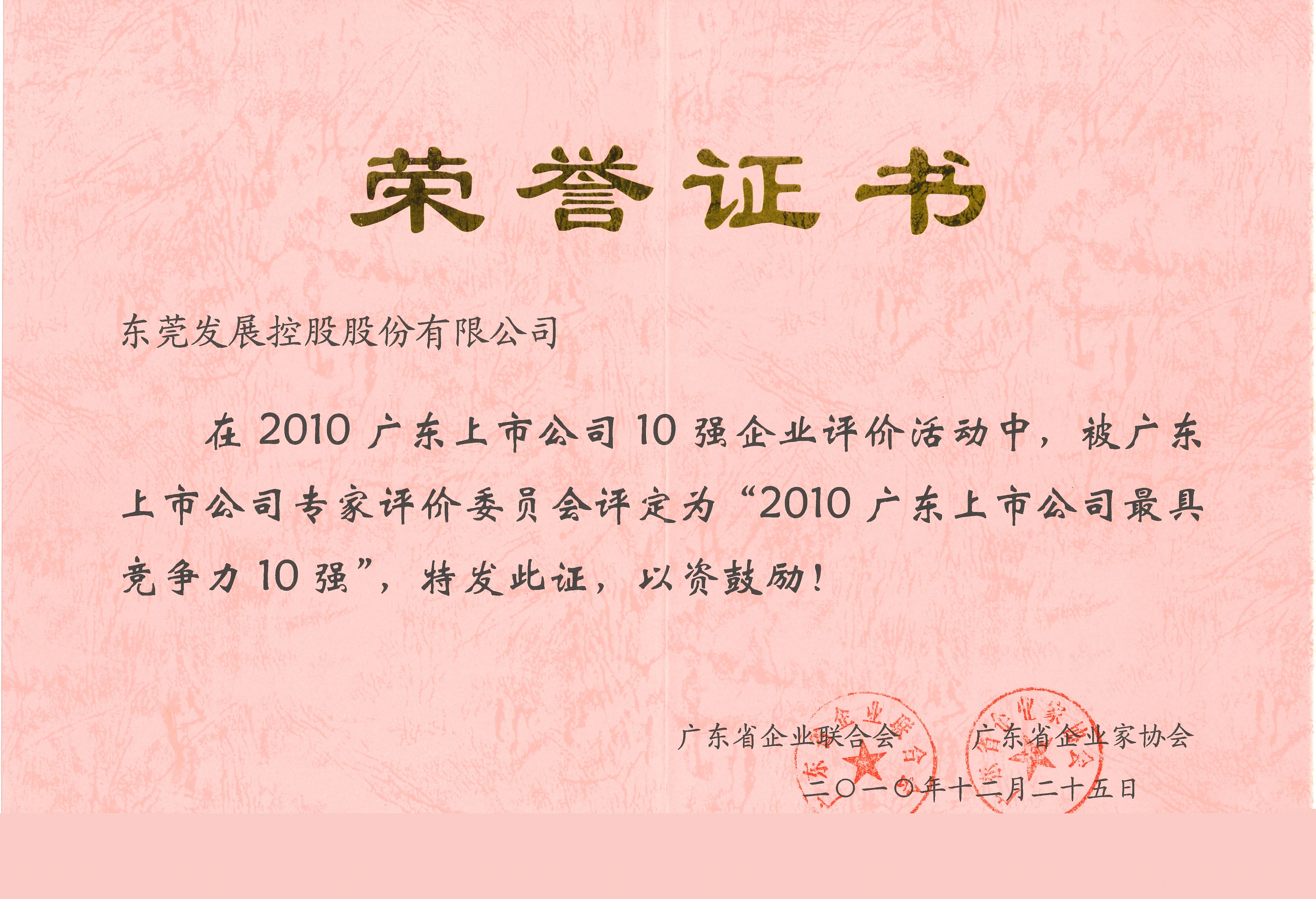 2010年12月,東莞控股榮獲“2010廣東上市公司最具競爭力10強”榮譽稱號。