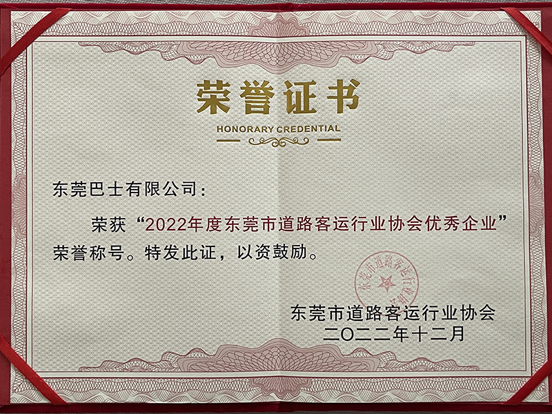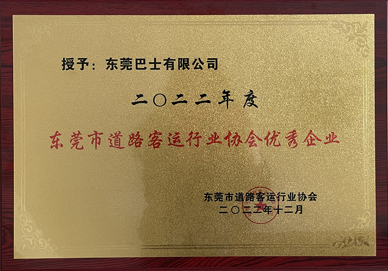 2022年12月,東莞巴士有限公司榮獲2022年度東莞市道路客運行業(yè)協(xié)會優(yōu)秀企業(yè)證書