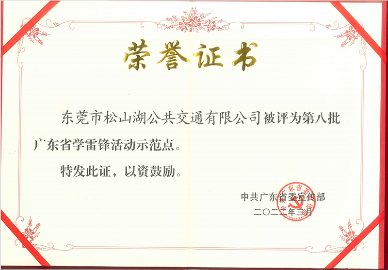 2022年3月,中共廣東省宣傳部授予東莞市松山湖交通有限公司2022年“第八批廣東省學雷鋒活動示范點”稱號