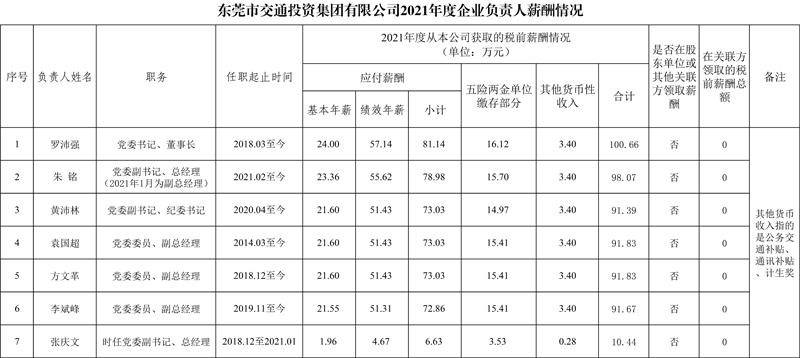 東莞市交通投資集團(tuán)有限公司2021年度企業(yè)負(fù)責(zé)人薪酬情況