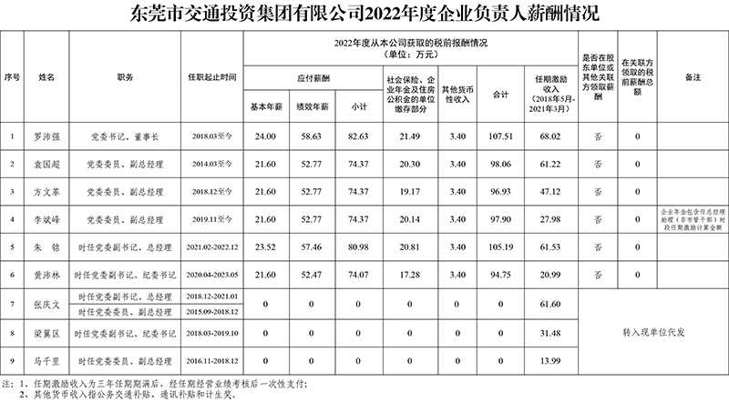 東莞市交通投資集團有限公司2022年度企業(yè)負責人薪酬情況